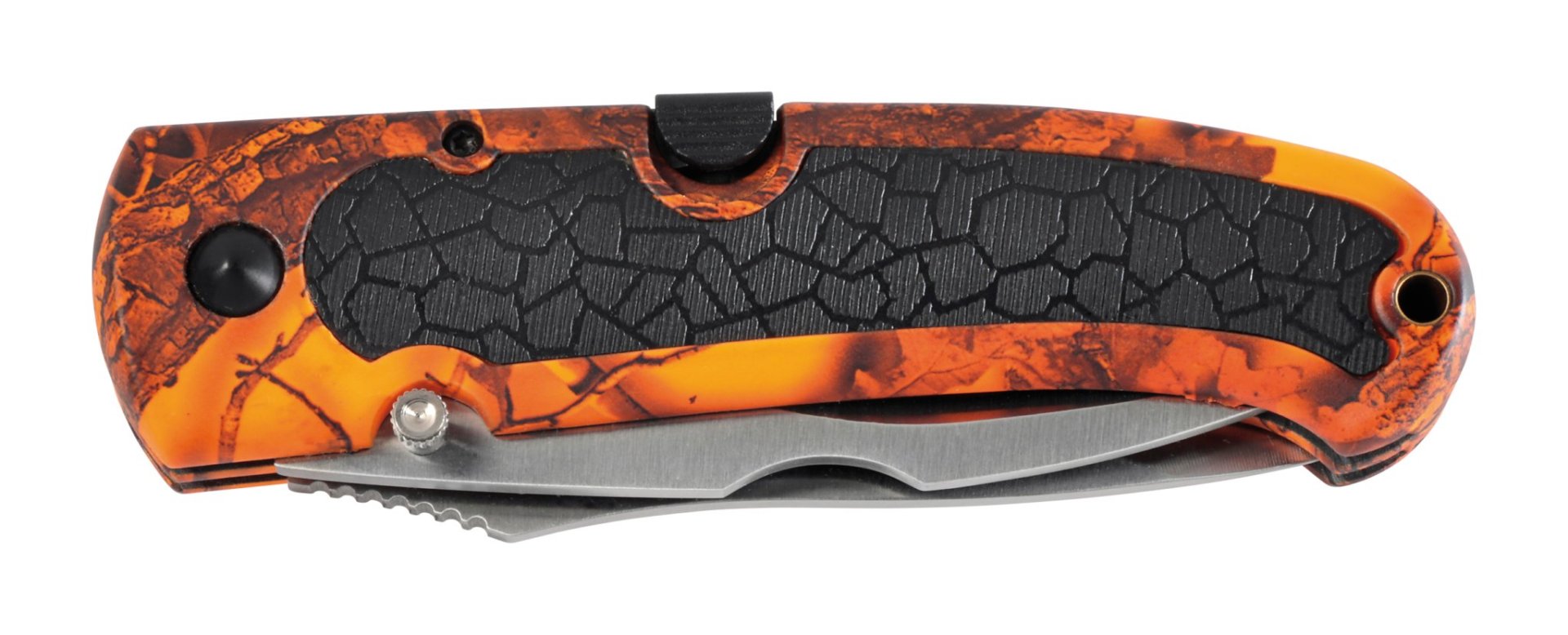 Couteau pliant avec 2 lames en Acier 420 carbone/chrome dont une pour éviscérer. Lame principale 12 cm. Manche ergonomique impression camo blaze. Grip renforcé. Cran de sécurité. Livré sous blister avec étui en polyester.