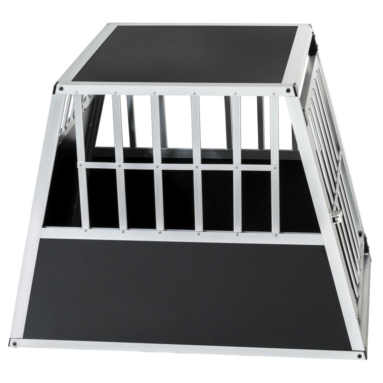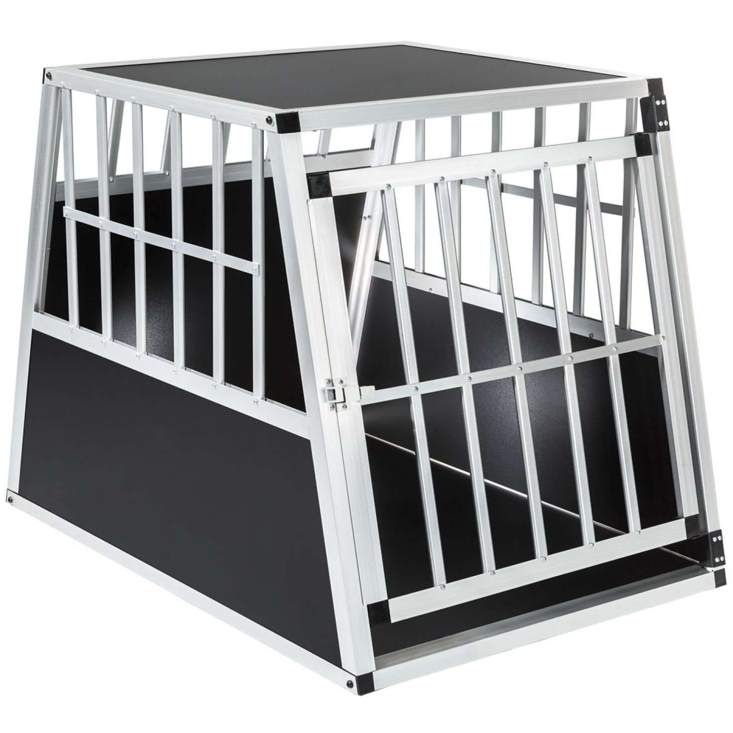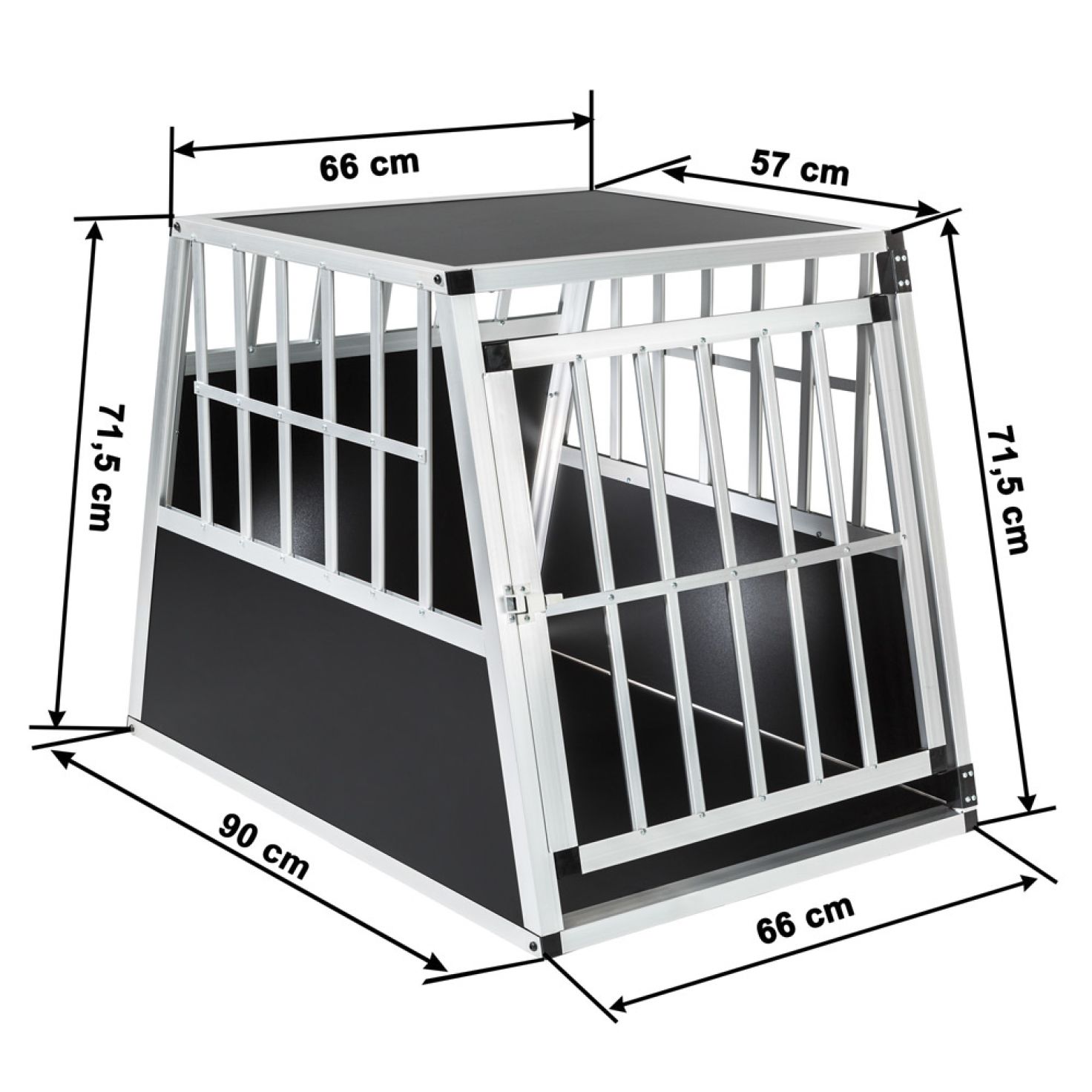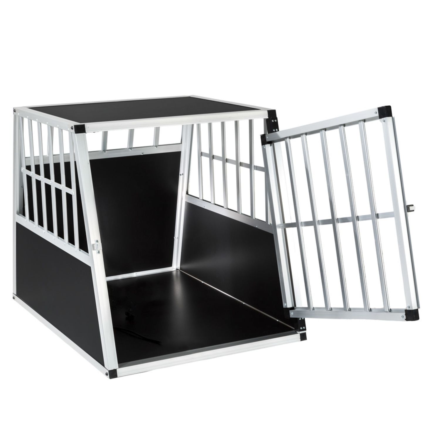 Cage, caisse, box de transport pour chien en Aluminium 66 cm x 90 cm x 69,50 cm TECTAKE. Cage de transport, Caisse de transport, Box de transport. Vous l'aimez, protégez votre fidèle ami à l’intérieur de votre véhicule grâce à notre cage de transport amovible pour chien. Peut servir de refuge et de lit pour votre chien.Des finitions soignées, des surfaces d’un entretien très aisé et le poids minime de cette cage de transport en font un produit de qualité très fonctionnel.Grâce à sa large grille, votre chien profitera pleinement d’air frais et d’une visibilité sans faille qui lui apportera un confort optimal.Le montage de cette cage de transport sera effectué en un tour de main.Les coins en plastique assurent à votre chien des déplacements sans blessures et facilitent le transport de la cage.Sa forme en trapèze le rend idéal pour le transport dans les voitures familiales.Paroi arrière inclinée.