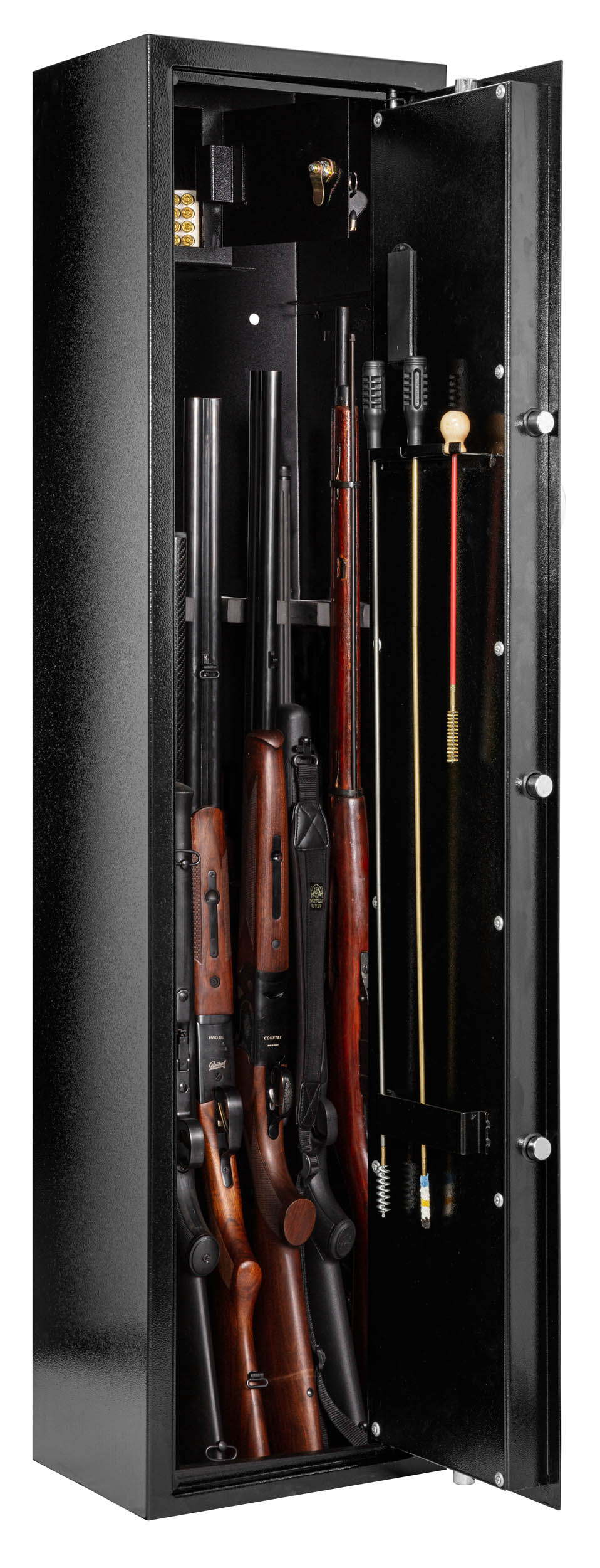 Serrure électronique à combinaison avec clef de secours (derrière le logement des piles). Porte épaisse avec verrouillage par tenons multiples actionnés par une poignée unique. 3 supports pour baguettes de nettoyage à l'intérieur de la porte.