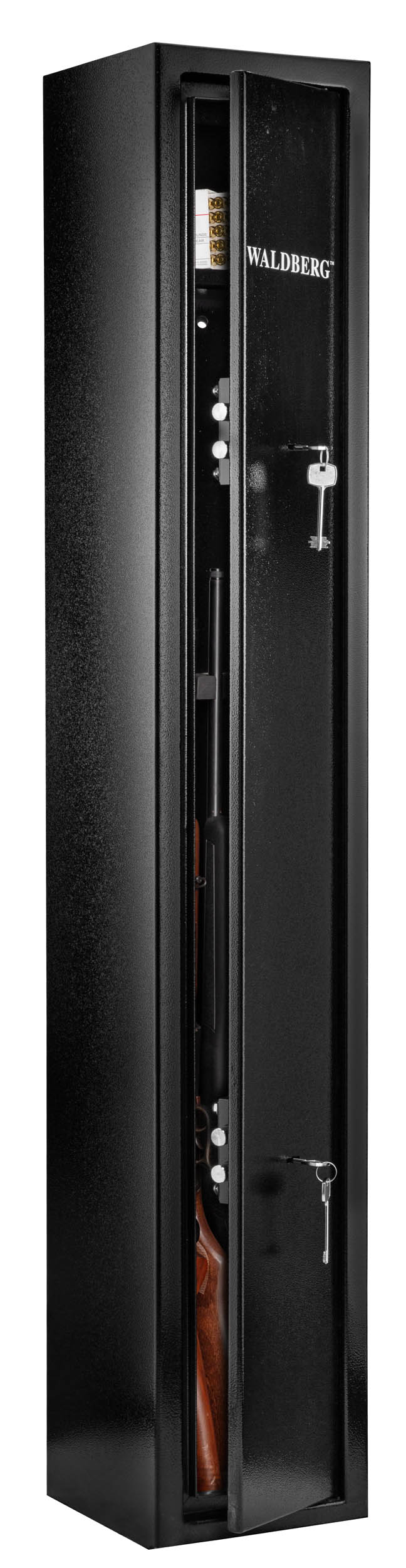 Finition suivant arrivage : porte de coffre avec sérigraphie blanche logo Waldberg ou avec logo Waldberg blanc autocollant. Tous nos coffres sont livrés avec un jeu de chevilles à béton de fixation, 2 clefs coffres à munitions et 2 x 2 clefs principales.