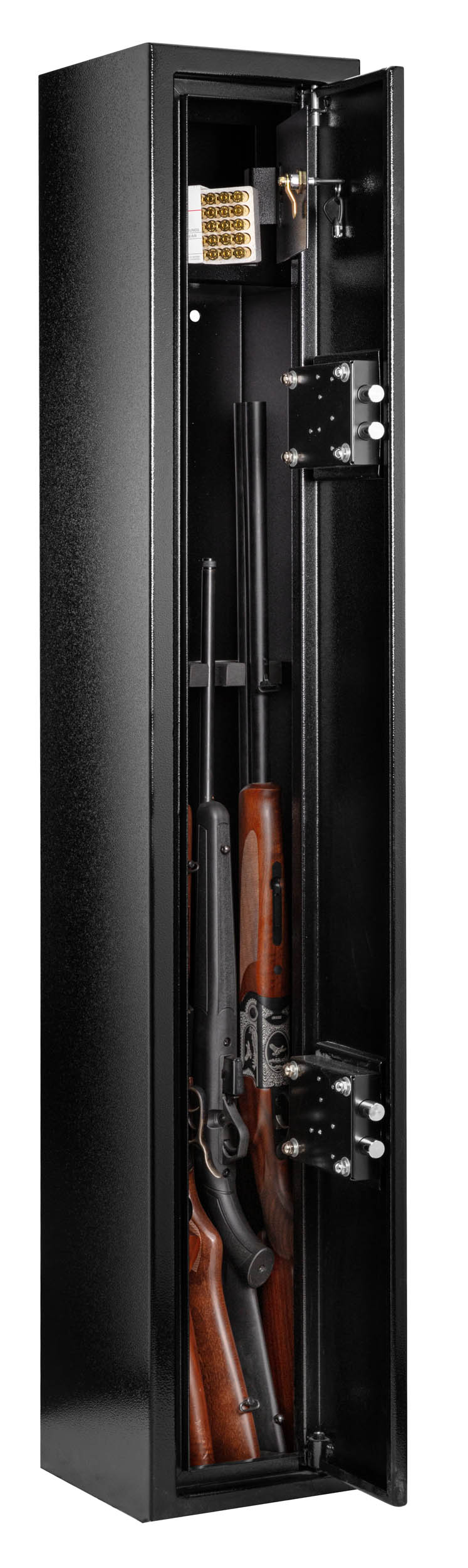 Porte mince équipée de 2 serrures à clefs actionnant directement les pennes. Intérieur des coffres peints en noir avec moquette grise au sol. Aménagements selon modèles. Coffre à munitions occupant le haut du coffre.